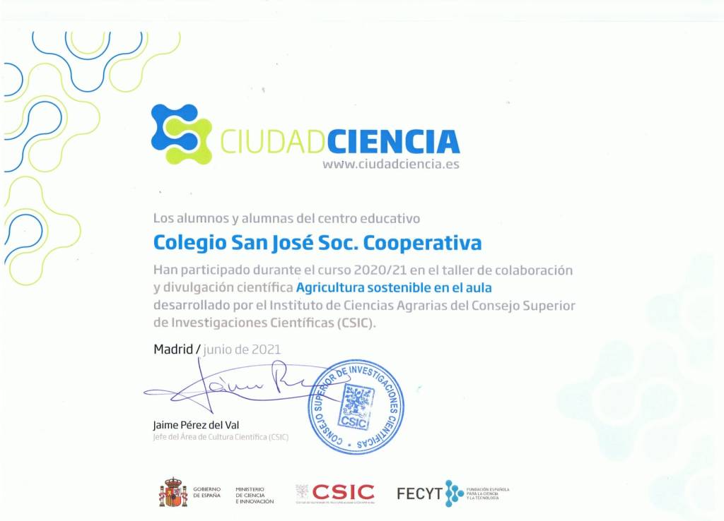 Esta mañana hemos recibido el certificado de Ciudad Ciencia acreditando nuestra participación en el taller de colaboración y divulgación científica «Agricultura sostenible en el aula». A nosotros nos encanta esta experiencia. El curso que viene volveremos a participar. Gracias a todos los que han hecho posible esta experiencia.