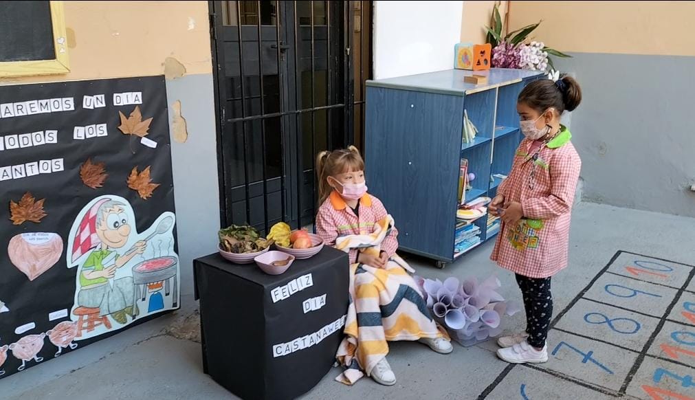 Asamos castañas (imaginario) y disfrutamos de la presencia de nuestro castañero. Tampoco nos hemos olvidado de cantar y bailar al ritmo de HALLOWEEN.