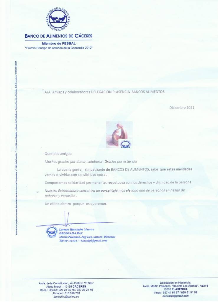 Esta mañana han venido varios voluntarios de la Delegación de Plasencia del Banco de Alimentos a recoger nuestra aportación para la Gran recogida de Alimentos de este año. Desde esta Delegación han manifestado su alegría ante la gran cantidad de kilos recogidos por nuestro cole y han destacado que el Colegio San José siempre es sinónimo de solidaridad y colaboración para seguir repartiendo alimentos a tantas familias como lo necesitan. También nos han enviado esta carta agradeciendo muy afectuosamente a toda la comunidad educativa de nuestro Colegio nuestra generosa aportación.