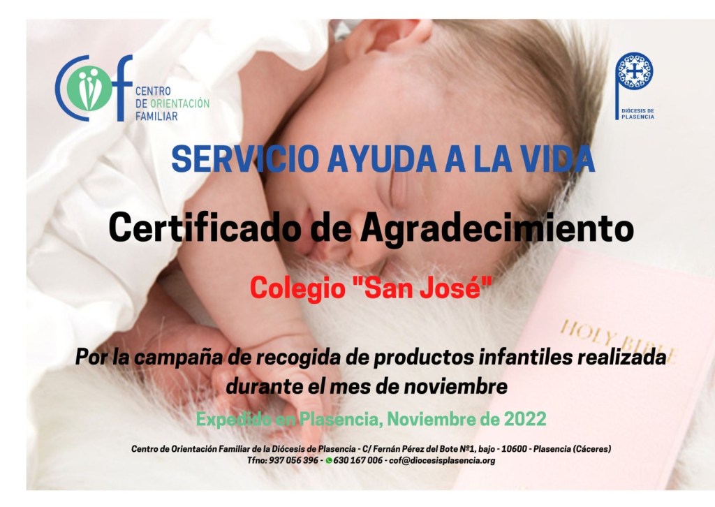 Hoy hemos recibido un diploma de agradecimiento de Ayuda a la Vida. Nosotros también les agradecemos a ellos su apoyo incondicional y su ayuda a los bebés de las familias que tienen menos recursos.