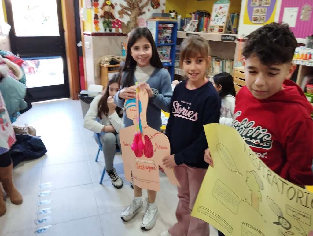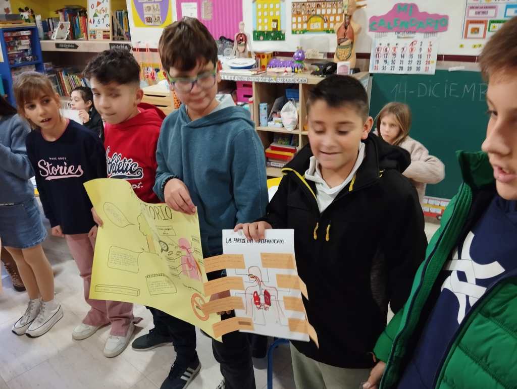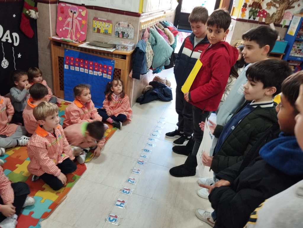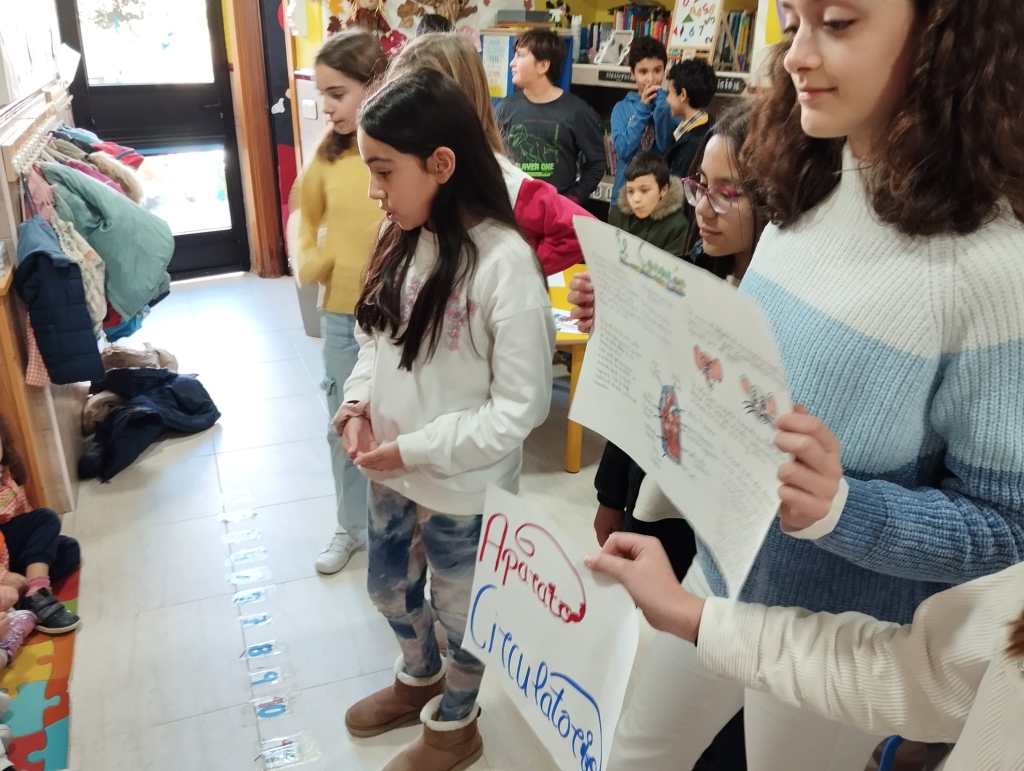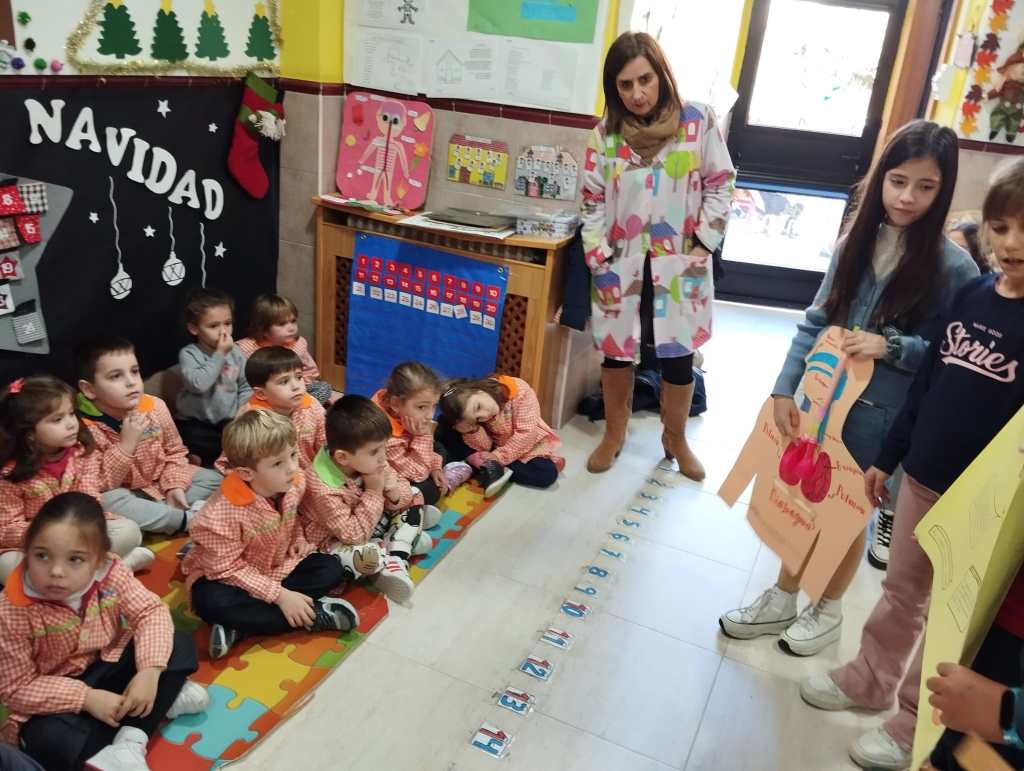 Los alumnos de 5° de Primaria han estado enseñando los conocimientos aprendidos sobre los aparatos que intervienen en la digestión y los huesos a los niños de 2° de infantil aprovechando que ellos también están aprendiendo el Proyecto del Cuerpo Humano.