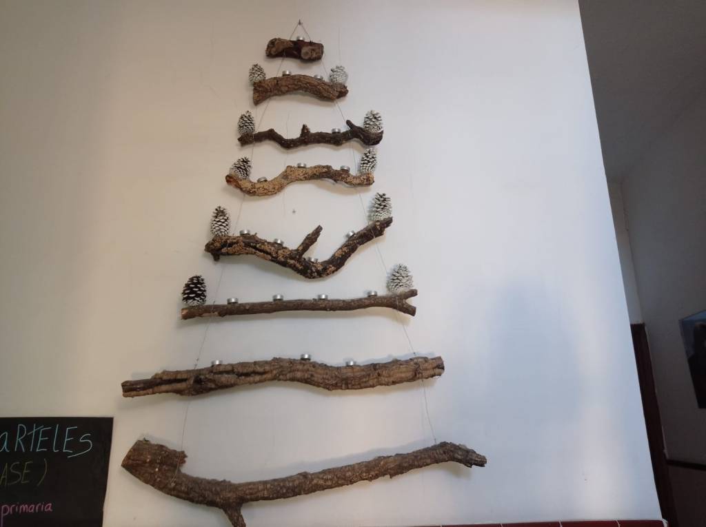 Aquí podéis ver algunos de los adornos que hicimos para enviar y el árbol con los adornos que hemos recibido de los demás colegios del proyecto.