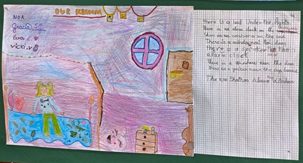 En la clase de 3º de Primaria hemos diseñado unas habitaciones muy chulas. Podéis verlas en las fotos, donde además os explicamos lo que hay en cada una. Y, ¿sabéis?, también conocemos ya muchas preposiciones de lugar. Mirad qué bien nos han quedado los trabajos: