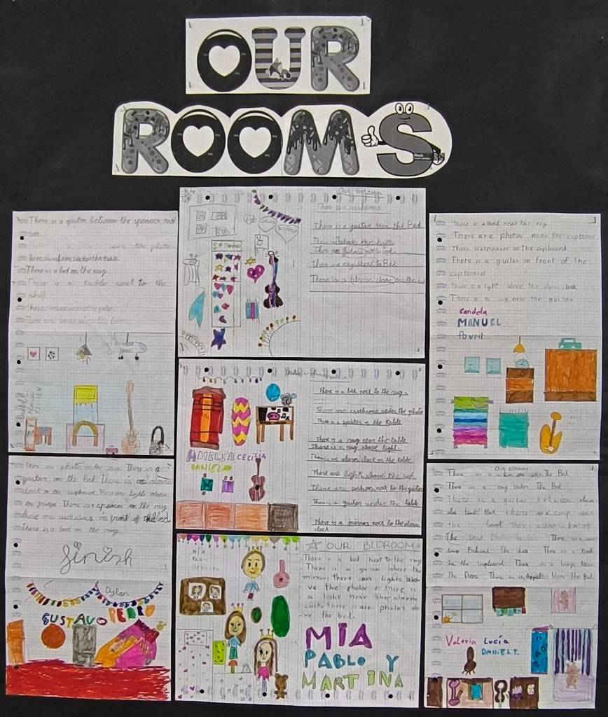 Os queremos enseñar las habitaciones que hemos diseñado en la clase de Inglés de 3º de Primaria. Con ellas hemos practicado el uso de there is – there are y de algunas preposiciones de lugar.