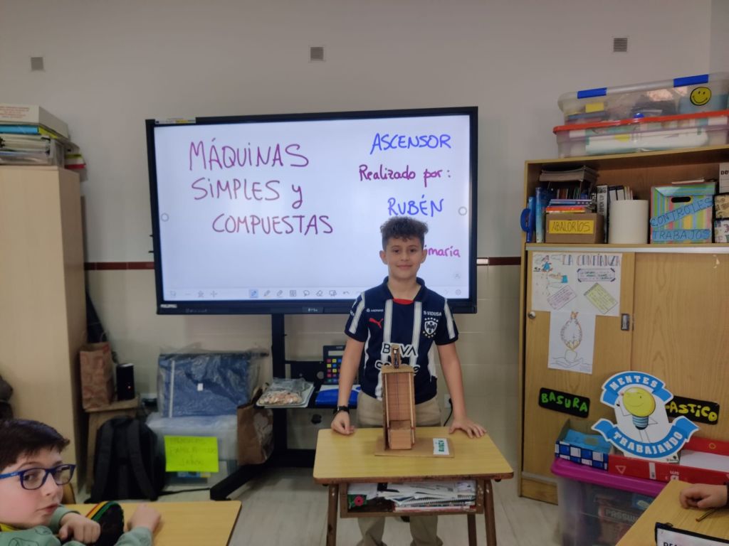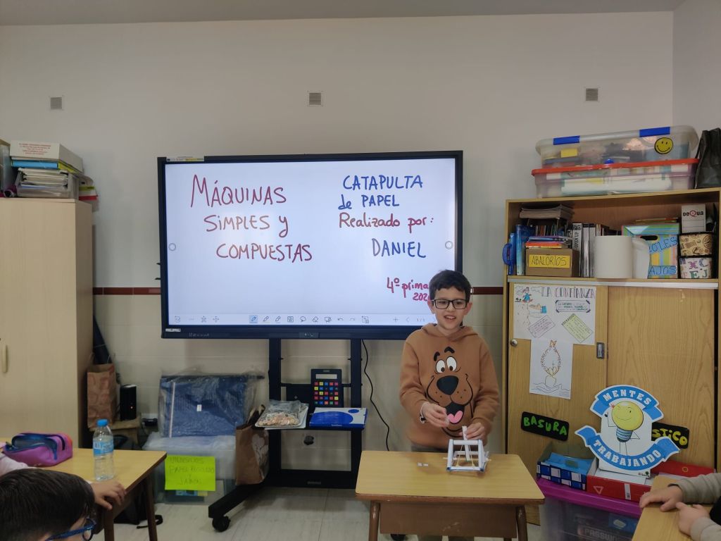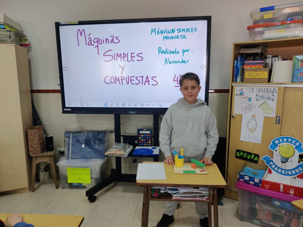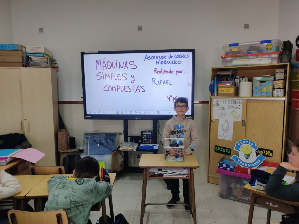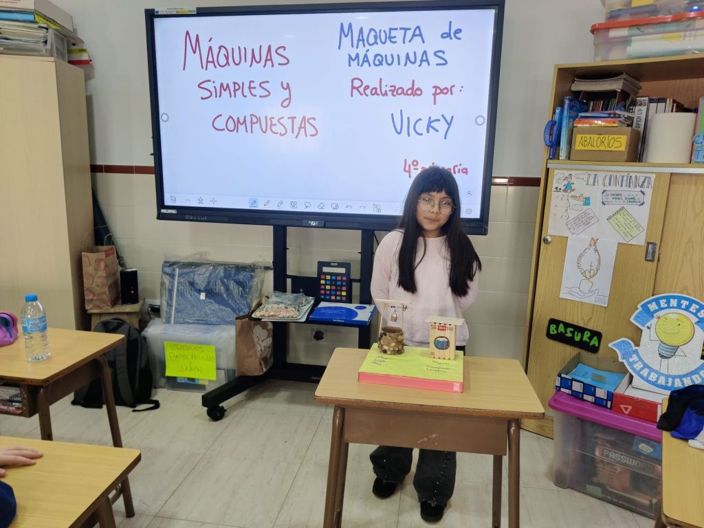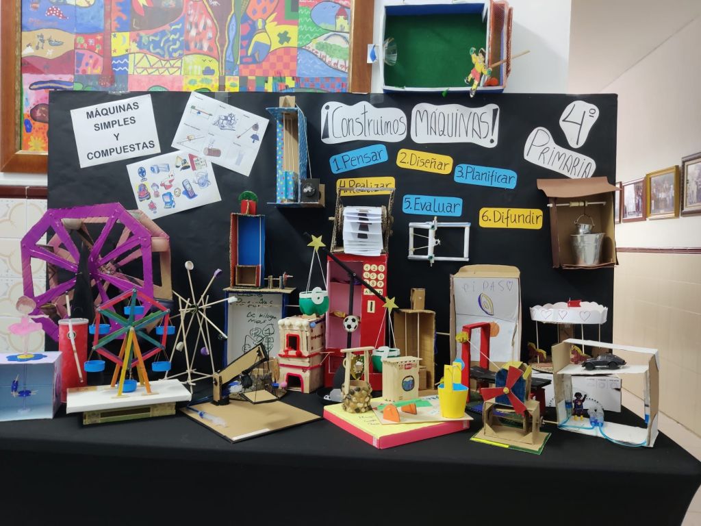 Al terminar el trimestre, los alumnos de 4° de primaria hicieron una exposición con sus maquetas sobre máquinas simples y compuestas. Previamente tuvieron que presentar y exponer en clase sus trabajos. ¡Qué bien quedaron!